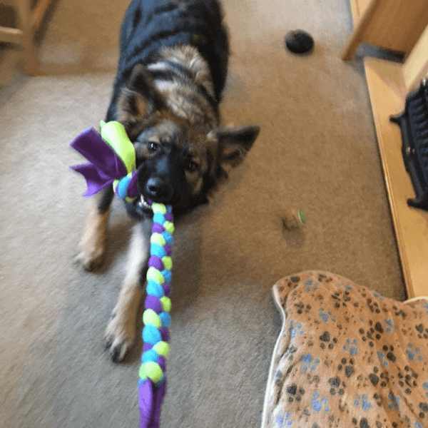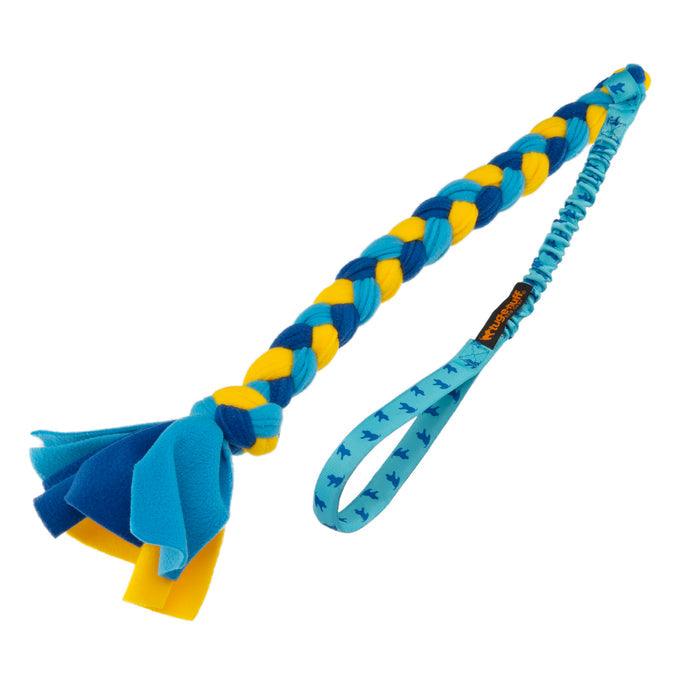 The short bungee handle offers a comfortable, secure grip, while taking some of the strain away from your arm and reducing the risk of jarring your shoulder or your dog's neck during a game. The braided fleece tug is super strong and will stand the test of time with even the most enthusiastic tugging dogs!