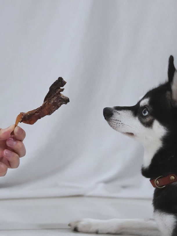 Our ostrich tendon are made of pure single-ingredient ostrich only, a novel protein chew that provides mid-level difficulty suitable for mid to hard chewers. The short tendon is around 10cm in length, good for dogs below 5kg who require some caloric control, but still chew hard. The flossing properties of ostrich tendons assists in dental health and flosses in between the teeth.
